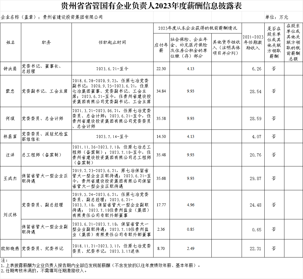 贵州省省管国有企业负责人2023年度薪酬信息披露表